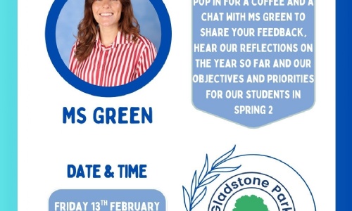 Pop in for a coffee and a chat with Ms Green to share your feedback, hear our reflections on the year so far and our objectives and priorities for our students in Spring 2